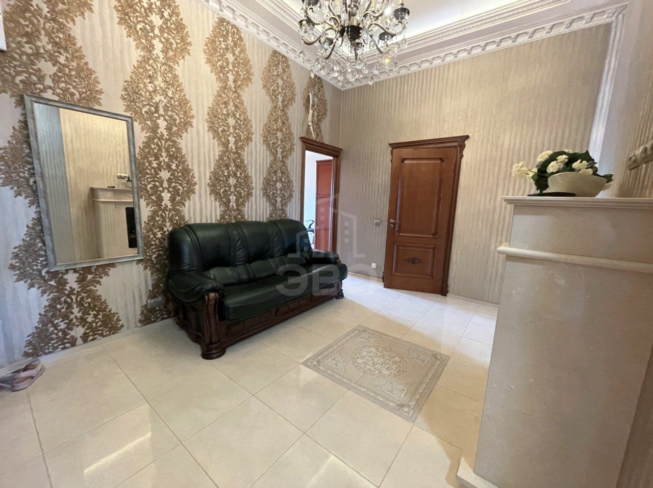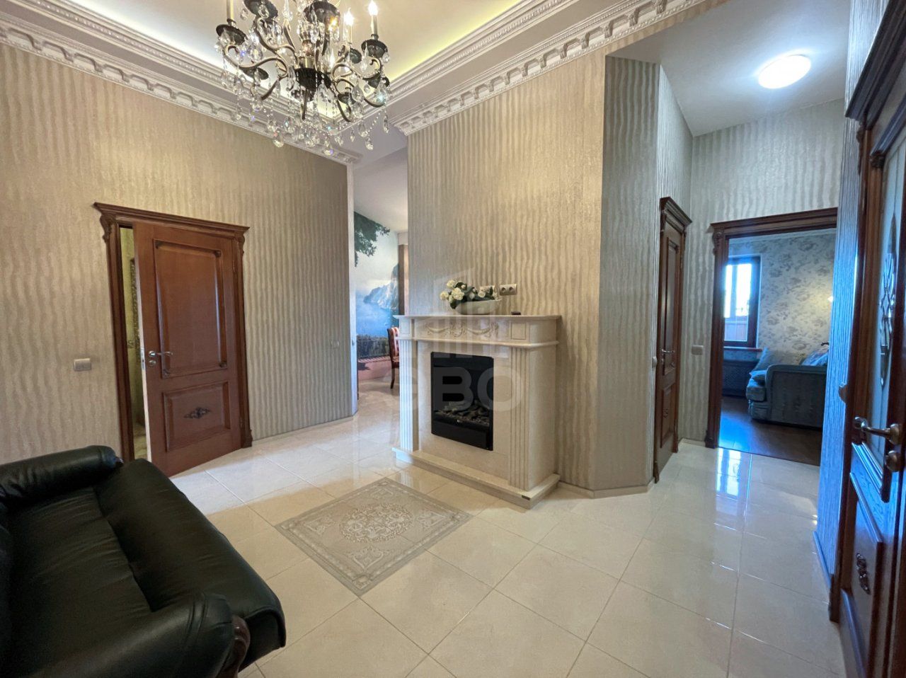 большая прихожая с диваном и камином;