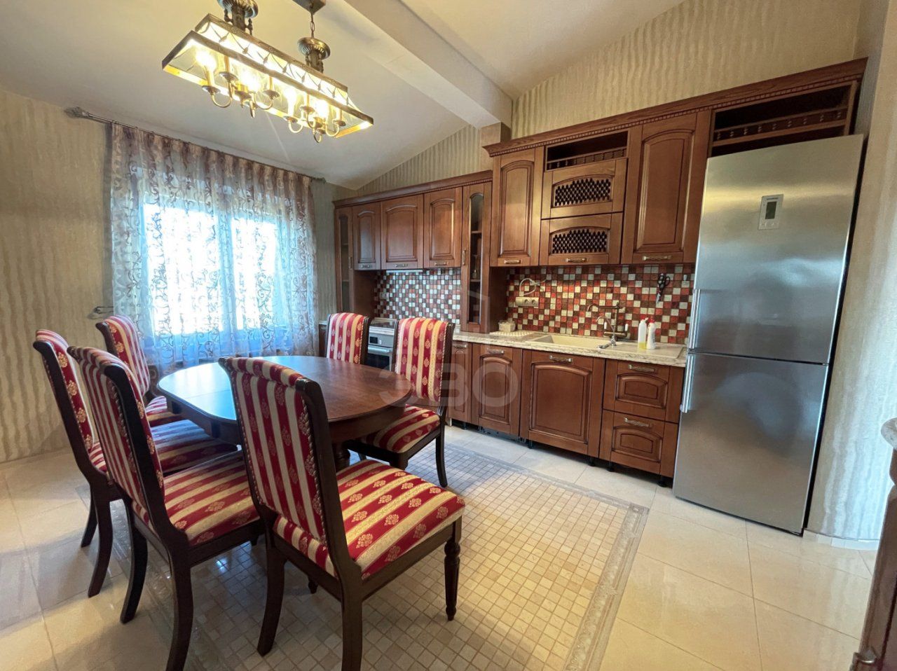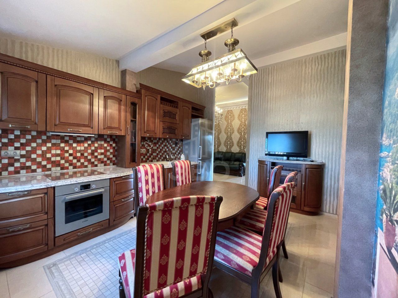 кухня-столовая с новой техникой (варочная панель, духовка, холодильник, посудомоечная машина, вытяжка);
