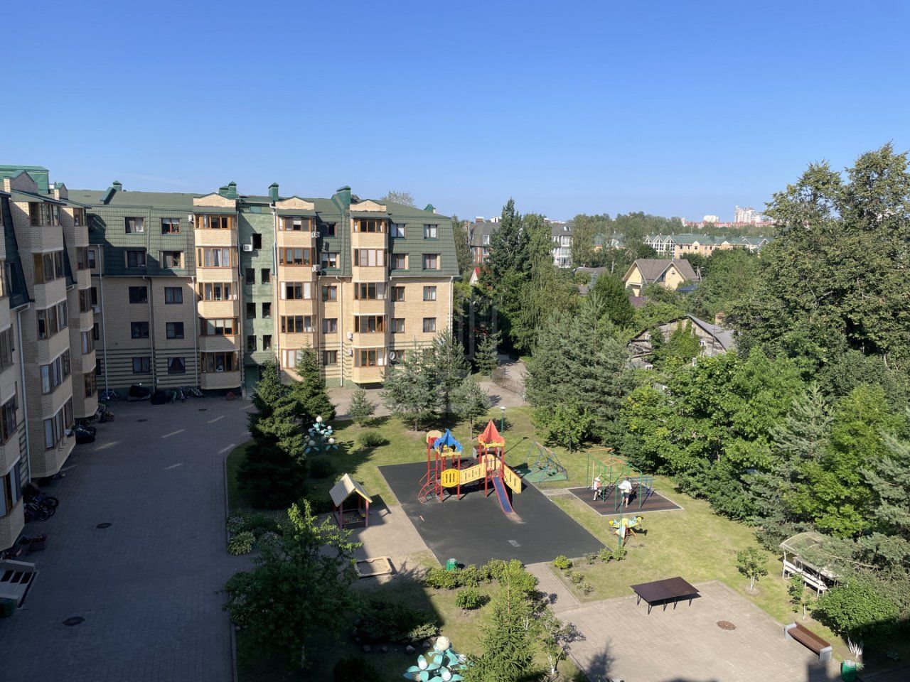 Закрытая территория дома с охраной, парковка со шлагбаумом. Во дворе детская площадка.