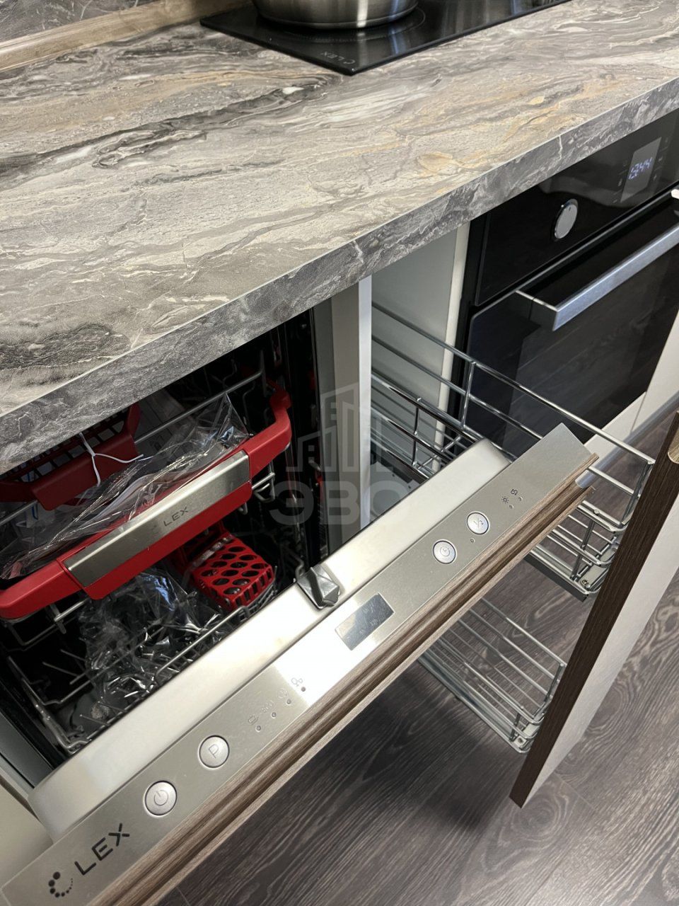 Кухня оборудована современной техникой и посудой: варочная панель, посудомоечная машина, духовой шкаф, большой холодильник, СВЧ- печь и электрический чайник.