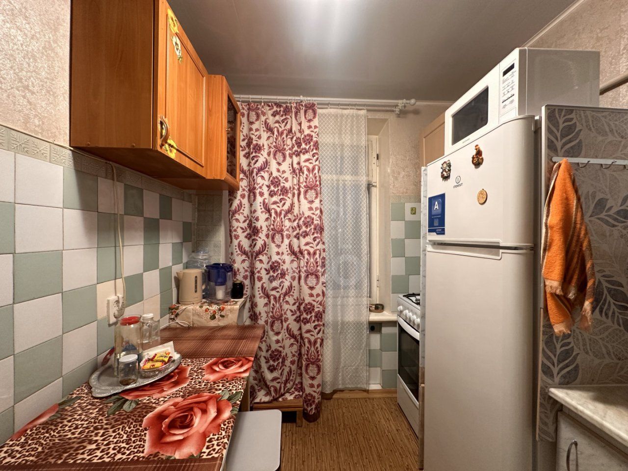 холодильник, газовая плита с духовкой для готовки, микроволновая печь, электрический чайник, базовая посуда для приготовления пищи;