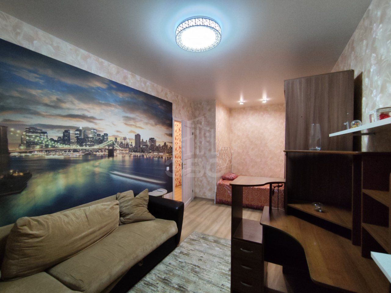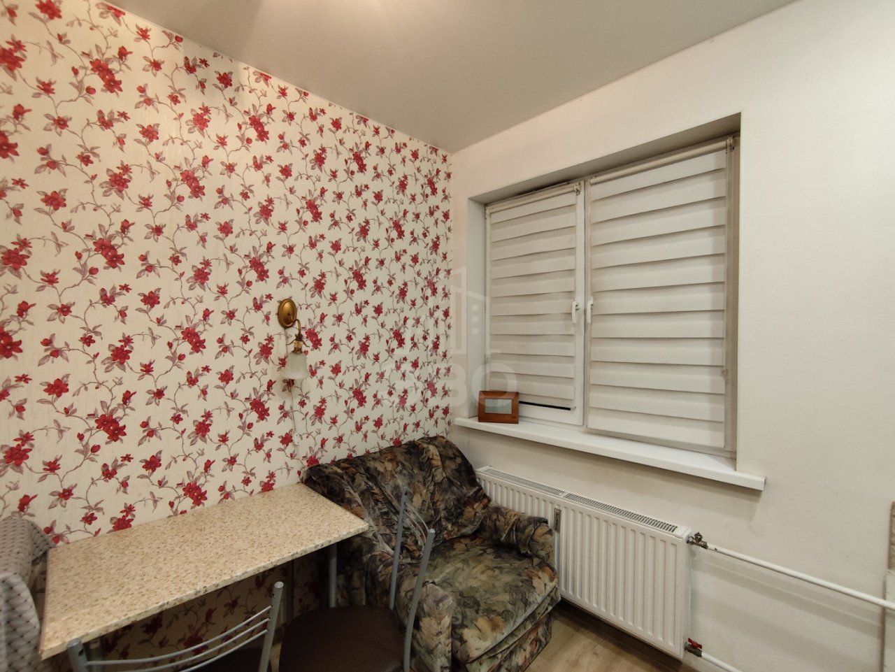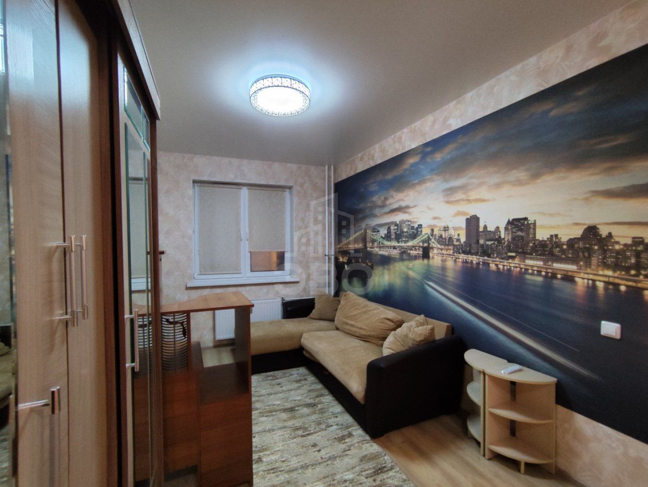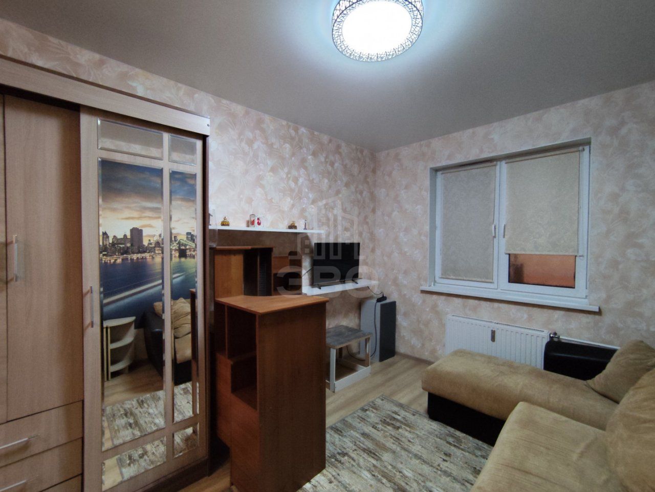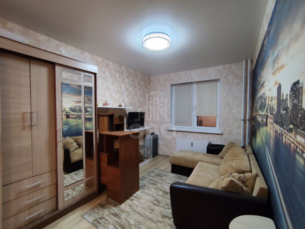 В комнате — раскладной диван, рабочее место, шкаф, телевизор, спальная зона представлена новой большой двуспальной кроватью. Всё необходимое уже есть: стиральная машина, пылесос, бытовая техника. Санузел раздельный, лоджия застеклена, потолки высокие, а коммунальные платежи умеренные.